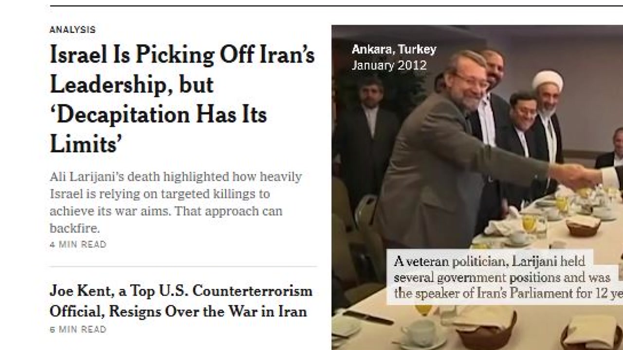 이스라엘이 공습으로 알리 라리자니 최고국가안보위원회 사무총장과 보안 민병대 바시지의 골렘레자 솔레이마니 사령관을 공습으로 제거한 것을 두고 한계가 뚜렷한 작전이라는 주장이 나왔습니다.