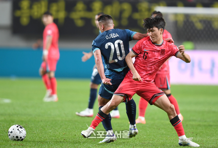 황인범이 지난해 10월14일 서울월드컵경기장에서 열린 남자 축구 국가대표 평가전 파라과이와 경기에서 상대와 볼다툼을 하고 있다. 최승섭기자 thunder@sportsseoul.com |
