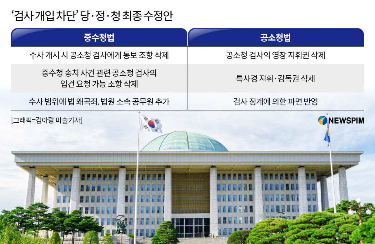 반면, 중수청이 다른 수사기관에 사건 이첩을 요구할 수 있는 우선수사권은 그대로 두면서, 중대범죄 범위에 판·검사의 법 적용 왜곡을 처벌하는 법왜곡죄와 법원 소속 공무원을 새로 포함해 중수청의 수사 대상은 기존안보다 넓어졌다.
