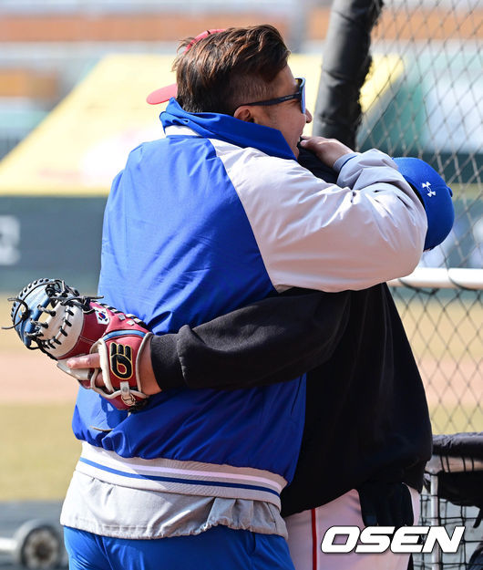 먼저 포옹해 주면서 안부 주고받는 박진만 감독과 조동찬 코치 |