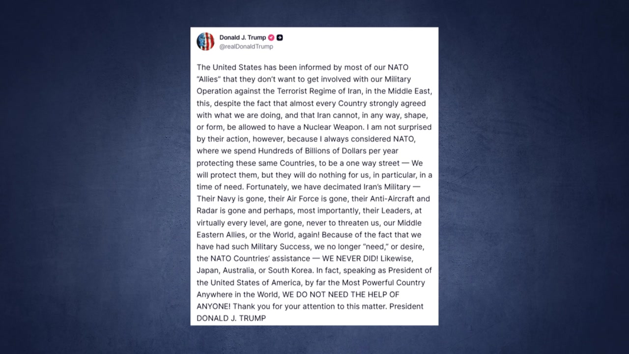 트럼프 대통령은 전날 북대서양조약기구 회원국 대부분이 대이란 군사작전에 관여하지 않겠다는 입장을 통보했다며 "누구의 도움도 필요 없다"는 말로 강한 불만을 드러냈습니다.