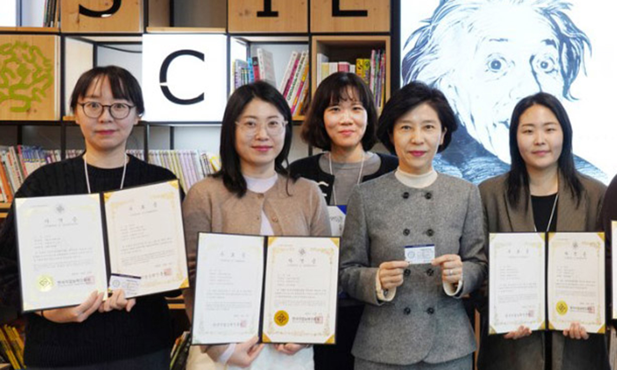 이난희 국립대구과학관 관장(왼쪽 네번째)과 직원들이 자격증서를 들고 기념촬영을 하고 있다. 대구과학관 제공