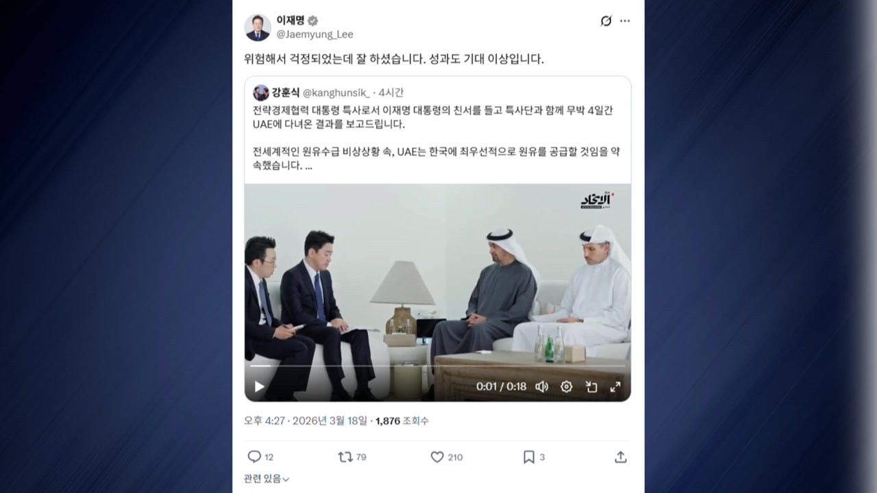 이재명 대통령은 어제(18일) SNS에, 최근 UAE를 방문하고 돌아온 강훈식 대통령비서실장을 칭찬하는 글을 올렸습니다.