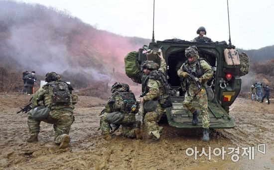 13일 경기 파주 무건리 훈련장에서 열린 아미타이거 시범여단 연합훈련에서 미 장병들이 장갑차에서 하차 후 전투 훈련을 하고 있다.사진=강진형 기자aymsdream@ |