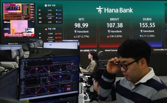 서부텍사스유(WTI)가 한때 100달러를 돌파한 가운데 19일 서울 하나은행 본점 딜링룸에 국제유가 정보가 표시되고 있다. 이날 코스피는 전 거래일 대비 2.76% 내린 5761.40에 원·달러 환율은 21.9원 오른 1505원으로 장을 시작했다.