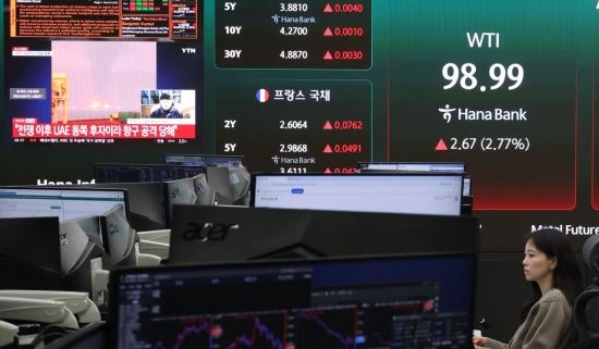 이스라엘이 이란 최대 가스전에 폭격을 가하고 이란이 맛대응 하면서 국제유가가 급등한 19일 서울 하나은행 본점 딜링룸에 국제유가와 관련뉴스 영상이 표시되고 있다.