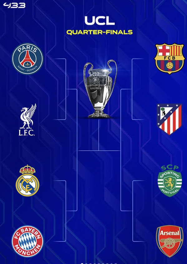 '별들의 무대' 유럽챔피언스리그(UCL) 8강 대진이 완성됐다. 스페인 프리메라리가가 가장 많은 세 팀을 배출했고, 잉글랜드 프리미어리그(EPL)가 두 팀, 독일 분데스리가, 프랑스 리그앙, 포르투갈 프리메이라리가가 각 한 팀씩 8강에 올렸다.