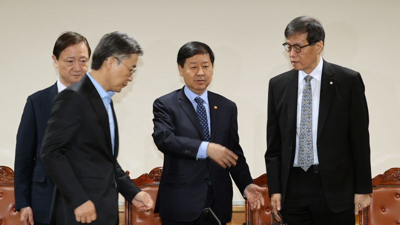 19일 오전 서울 중구 은행회관에서 열린 확대거시경제금융회의에서 이찬진(왼쪽부터) 금융감독원장과 구윤철 경제부총리, 이창용 한국은행 총재, 권대영 금융위원회 부위원장이 참석해 기념촬영을 하고 있다. 사진=서동일 기자 |