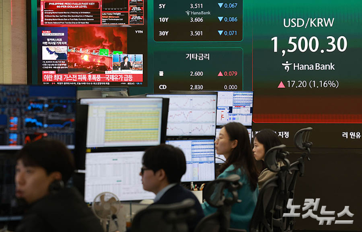 이스라엘이 이란 최대 가스전에 폭격을 가하고, 이란이 주변국 에너지 시설에 반격하면서 국제유가가 급등하는 등 이란 전쟁이 격화되자 원·달러 환율은 1500원을 재돌파한 가운데 19일 오전 서울 중구 하나은행 딜링룸에 환율이 표시돼 있다.