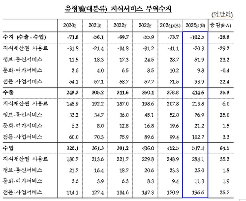 한국은행이 19일 공개한 '2025년 지식서비스 무역통계(잠정)'에 따르면 지난해 지식서비스 무역 수지는 102억5천만달러(약 15조3천890억원) 적자로 집계됐다. 전년(-73억7천만달러)보다 적자 규모가 28억8천만달러(약 4조3천억원) 늘었다. 이는 2010년 통계 작성 이후 최대다.