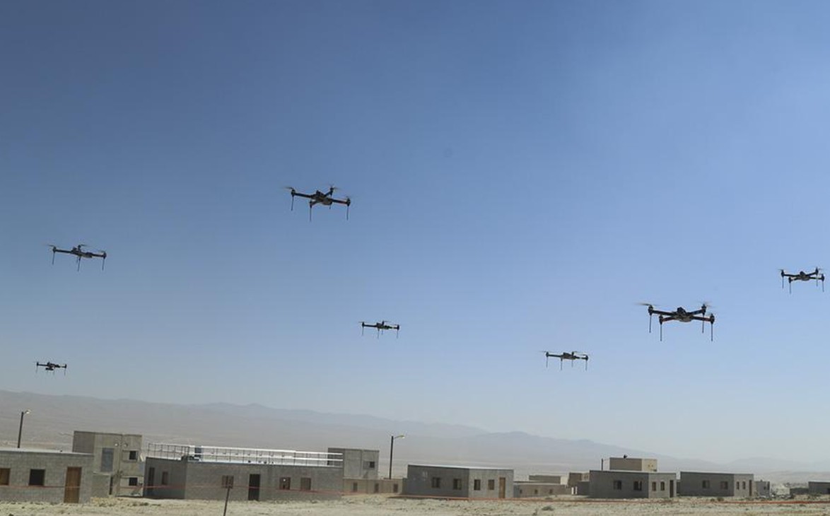우크라이나 전쟁 이후 각국 군이 전장에 투입하고 있는 군용 드론 군집비행 상상도. 저비용·고효율 드론이 '게임체인저'로 부상하면서 우리 군도 전력 구조 재편에 나섰다. [사진=Military drone swarm illustration] 2026.03.19 gomsi@newspim.com