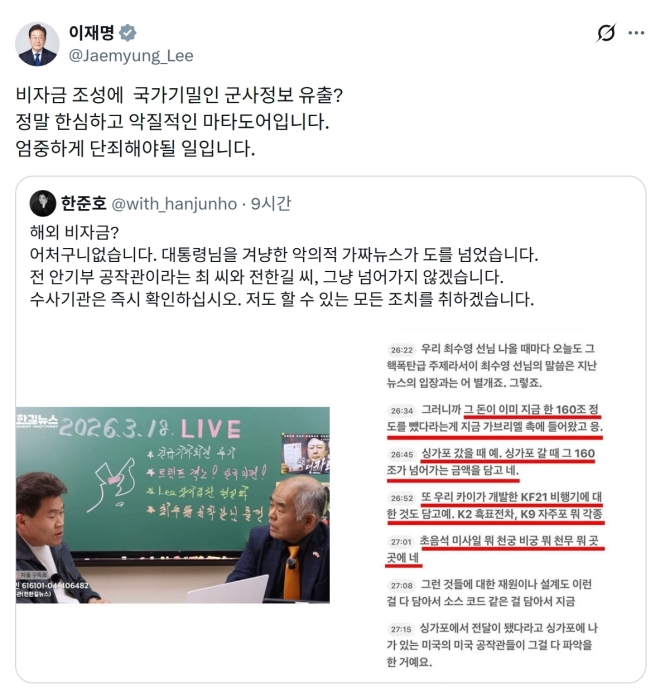 이 대통령은 이날 엑스(X·옛 트위터)에 한준호 더불어민주당 의원의 게시글을 인용하며 “비자금 조성에 국가기밀인 군사정보 유출? 정말 한심하고 악질적인 ‘마타도어’(흑색선전)다. 엄중하게 단죄해야 할 일”이라고 썼다.