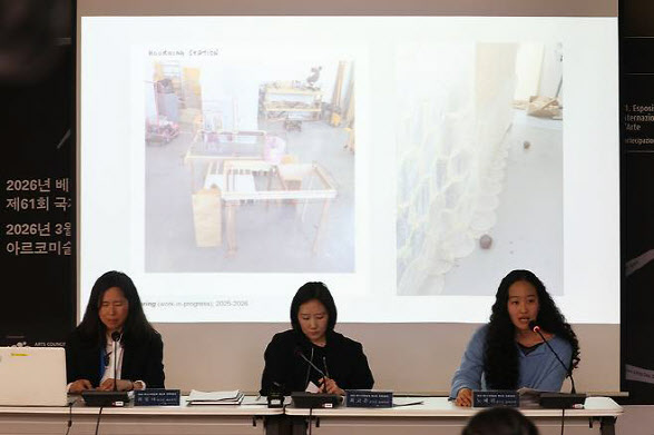 19일 서울 종로구 아르코미술관에서 열린 ‘2026년 베니스비엔날레 제61회 국제미술전’ 한국관 전시 간담회에 참석한 최빛나 한국관 예술감독(왼쪽부터), 최고은 작가, 노혜리 작가(사진=연합뉴스). |