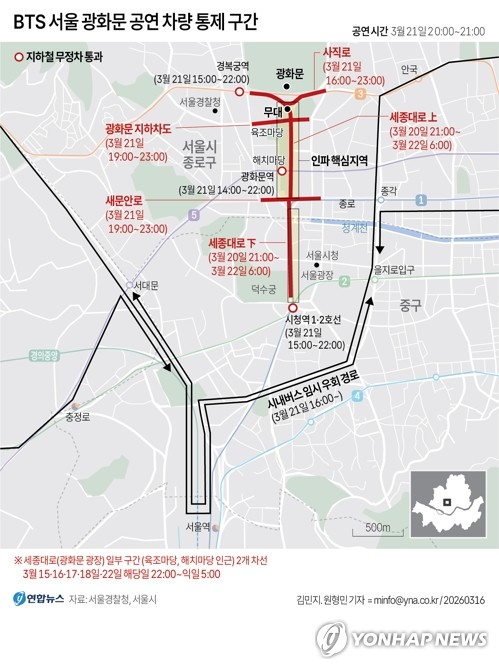 공연 당일인 21일에는 사직로·율곡로(오후 4시∼11시), 새문안로(오후 7시∼11시), 광화문지하차도(정부청사→이마교차로 방향·오후 7시∼11시)가 통제된다.