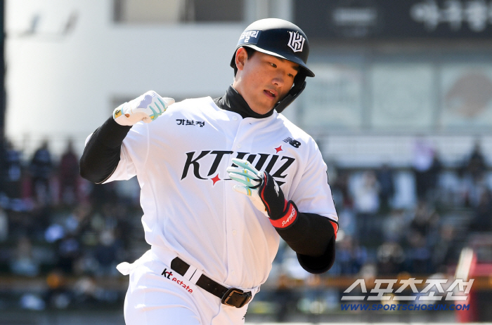 안현민 괴물 같은 파워에 KT 더그아웃 분위기는 뜨거워졌다. |
