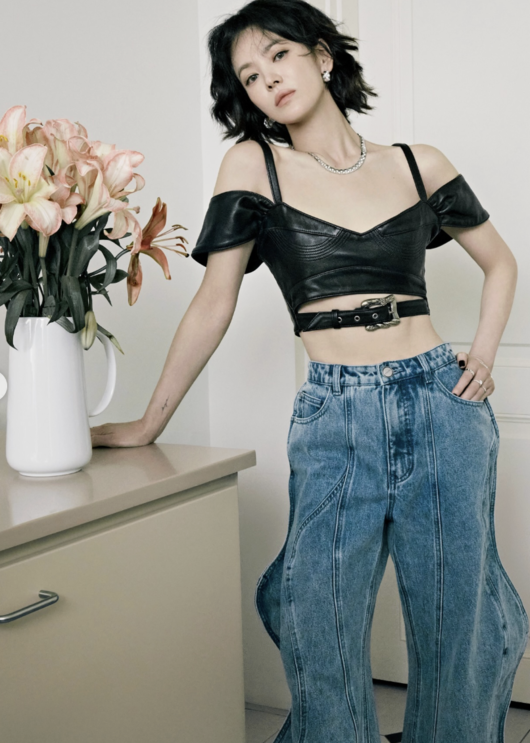 특히 블랙 가죽 크롭톱에 와이드 데님 팬츠를 매치한 컷에서는 탄탄한 복근이 드러나며 시선을 사로잡았다. 어깨 라인을 드러낸 과감한 디자인과 슬림한 실루엣이 어우러지며 한층 성숙해진 관능미를 강조했다.