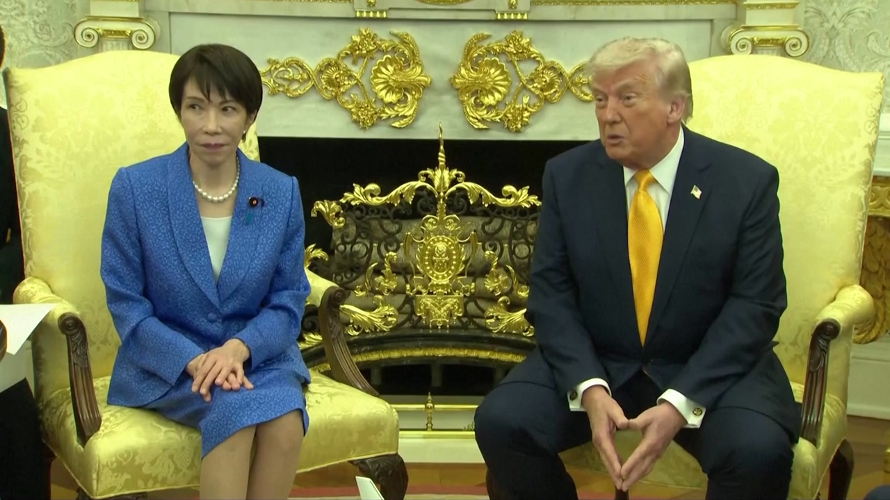 트럼프 대통령이 호르무즈 해협 군함 파견을 압박한 가운데 진행된 미일 정상회담, 복잡한 속내를 읽을 수 있었던 발언이 나오는가 하면 양국 정상 간 화기애애한 모습도 볼 수 있었는데요. 먼저 이 모습 화면으로 보시겠습니다. 백악관에 도착하자마자트럼프 대통령에 와락 안긴다카이치 사나에 총리. 반갑게 인사를 나누던 중에엄지손가락 두 개를 치켜세워보기도 하죠. 이렇게 상당히 화기애애한 첫 인사로두 사람의 만남은 시작됐습니다. 공개된 자리에서도단연 관심을 모았던 주제는이란 전쟁 이야기였는데요. 트럼프 대통령은 일본의적극적 반응을,다카이치 총리는 다소원론적 입장을 밝혔습니다. 그런가 하면 다카이치 총리의 눈을휘둥그레 만들 만한수위 높은 발언이 나오기도 했는데요. 일본 기자의 질문에답하는 과정에서였습니다.