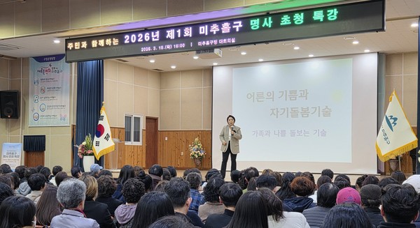 (인천=국제뉴스) 이병훈 기자 = 인천 미추홀구는 지난 19일 구청 대회의실에서 주민 360여 명을 대상으로 '2026년 제1회 미추홀구 명사 초청 특강'을 열고 명사의 지식, 경험을 주민들과 공유했다.