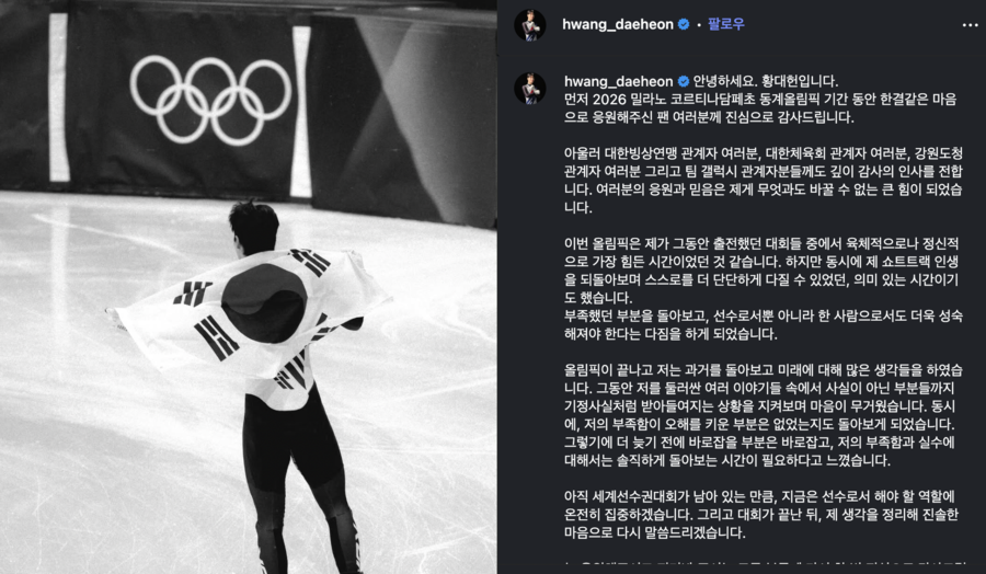 그럼에도 황대헌은 성적으로 자신의 가치를 증명해왔다. 2016년부터 태극마크를 달고 세 차례 올림픽에 출전해 금메달 1개와 은메달 4개, 총 5개의 메달을 수확했다. 이번 밀라노·코르티나담페초 동계올림픽에서도 은메달을 추가하며 꾸준한 경쟁력을 이어갔다. 다만 이번 세계선수권에서는 메달 없이 대회를 마무리하며 아쉬움을 남겼다.