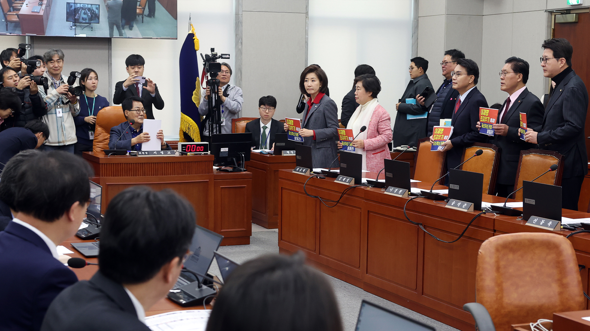 울며 겨자먹기로 특위에 참여한 국민의힘은 회의 시작 10분이 지나서야 피켓을 들고 등장했다가, 민주당의 일방적인 회의진행에 항의하며 그대로 퇴장했습니다.