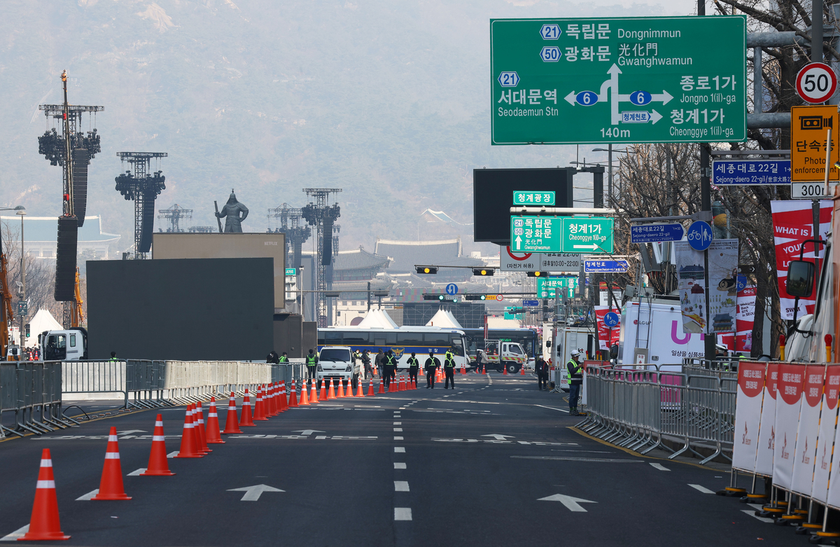 경찰버스 차벽도 설치됐다. 경찰은 메인 무대를 중심으로 적선교차로에서 동십자각교차로 구간은 ‘진공 상태’로 만들어 일반인의 출입을 막았다. 공연 관계자 동선과 일반 관람객 동선이 겹치지 않도록 분리 운영하는 것이다. 주변 빌딩 31곳은 ‘꼼수 관람’을 막기 위해 출입이 통제되고 있다. 대한민국역사박물관은 임시로 휴관하고, 세종문화회관은 공연을 취소하기도 했다. 다만 결혼식이 진행되고 있는 프레스센터의 경우 개방을 해놨지만 경찰은 휴대용 금속탐지기 등을 동원해 하객들을 상대로 검색 절차를 진행한다. 일부 하객들은 청첩장을 달라는 경찰의 말에 황급히 가방을 뒤지거나 지인에게 모바일 청첩장을 보내달라 부탁한 뒤 기다리기도 했다.