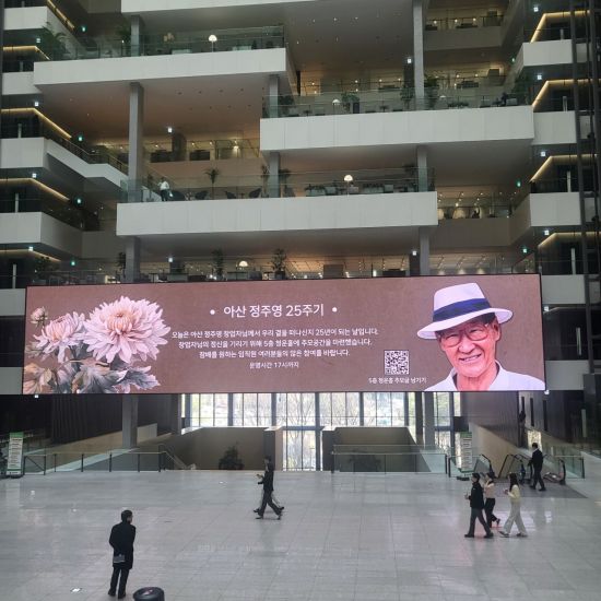 HD현대 임직원들이 직접 보낸 메시지였다. HD현대는 정주영 명예회장 서거 25주기를 맞아 온라인 추모 페이지를 통해 메시지를 남기면 사옥 5층 청운홀에서 스크린으로 함께 볼 수 있는 공간을 마련했다. HD현대에 따르면 수백 건의 메시지가 직접 접수됐으며 모두 스크린을 통해 공유됐다.