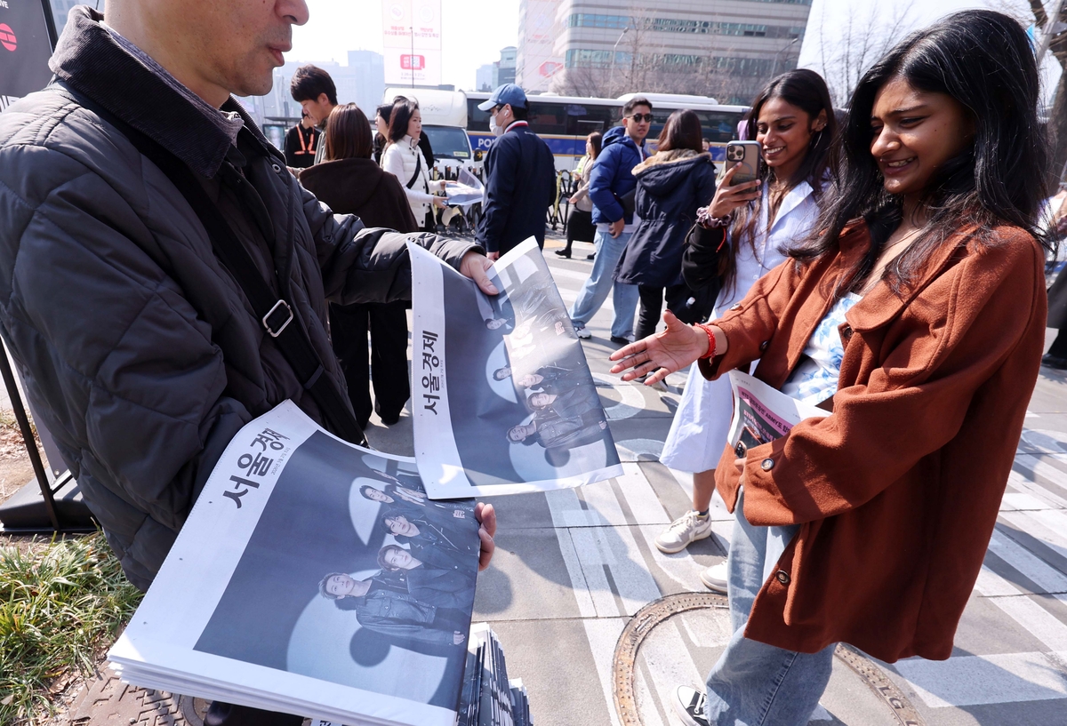 서울경제 특별판을 받기 위해 줄을 선 스위스인 조이(25) 씨는 “우리 나라에서는 볼 수 없는 특별한 선물이다. 스위스에서는 신문에 연예인 사진이 이렇게 크게 나오는 경우가 거의 없다”며 “신문에 사진이 정말 선명해서 액자에 넣어 보관할 생각이다. 인스타그램으로 보는 사진도 좋지만 직접 한국 광화문에서 이 신문을 받았다는 물리적인 증거가 있는 거니까 소중하다”며 신문을 흔들어보였다.