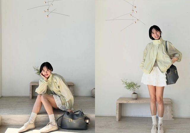 사진 속 손예진은 화이트 미니 스커트에 형광 노랑색상의 가벼운 점퍼를 입고 화사한 미소를 짓고 있다.