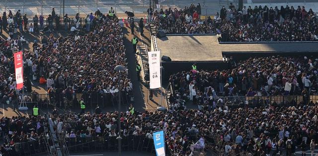 서울시에 따르면 오후 6시 기준 광화문 인근에는 3만명이 넘는 사람들이 모인 것으로 파악됐다. 인구 혼잡도는 ‘약간 붐빔’ 수준으로 무대 안 입장이 시작되면서 인파는 빠르게 늘고 있으며 입장 마감은 오후 7시다.