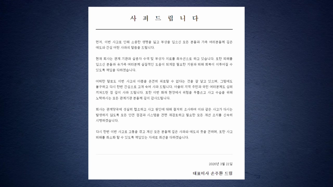 손주환 안전공업 대표이사는 오늘(21일) 홈페이지를 통해 이번 사고로 소중한 생명을 잃고 다치신 모든 분과 가족 여러분께 깊은 애도와 진심 어린 사과의 말씀을 드린다고 밝혔습니다.
