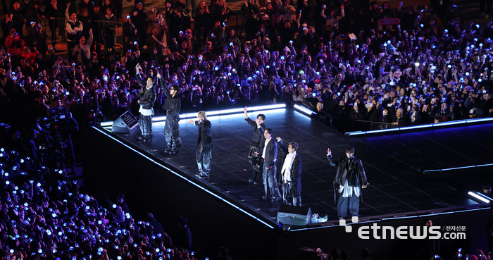 BTS는 이날 한국을 대표하는 역사와 문화 공간인 광화문 광장에서 전날 발표한 정규 5집 '아리랑'에 수록된 신곡 무대를 공개했다. '아리랑'은 군 복무와 솔로 활동 등으로 인한 공백기 후 3년 9개월 만에 공개하는 완전체 앨범이다.