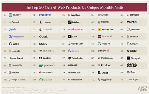 이번 순위는 시장조사기관 시밀러웹과 센서타워의 올해 1월 트래픽 데이터를 기반으로, 전 세계 소비자들이 실제로 가장 많이 사용하는 AI 서비스를 집계한 결과다.
