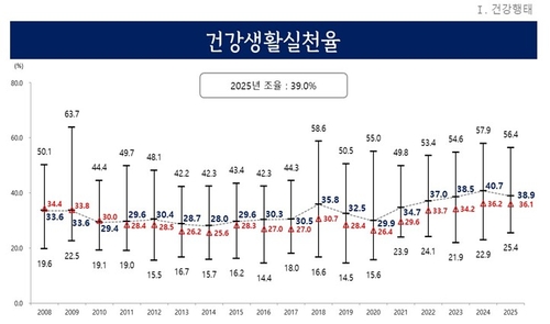22일 경기도에 따르면 도내 48개 보건소가 작년 5~7월 31개 시군의 19세 이상 4만3천637명을 대상으로 실시한 '2025년 지역사회건강조사' 결과 건강생활실천율이 38.9%로 나타났다.