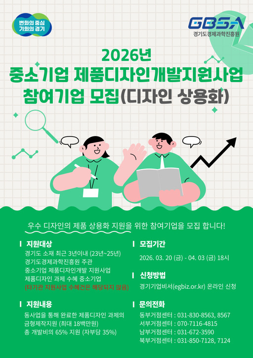 경기도와 경기도경제과학진흥원(이하 경과원)은 20일 '2026년 중소기업 제품디자인개발 지원사업' 참여기업을 모집한다고 밝혔다.