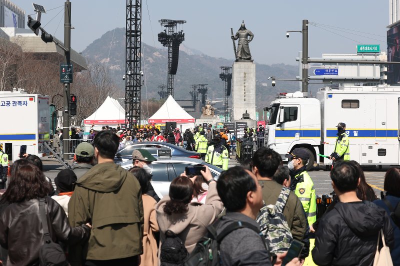 그룹 방탄소년단(BTS)이 정규 5집 '아리랑'(ARIRANG) 발매를 기념해 무료 공연 'BTS 컴백 라이브: 아리랑'(BTS THE COMEBACK LIVE|ARIRANG)을 여는 21일 서울 광화문 광장에서 시민들이 이동하고 있다. /사진=연합뉴스 |
