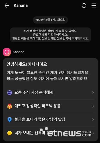 카카오가 지난 17일 '카나나 인 카카오톡' 정식 서비스를 시작했다. 스마트폰에 온디바이스 인공지능(AI)을 설치하면 카카오톡의 카나나 대화방에서 서비스를 시작할 수 있다. 카나나 인 카카오톡 시작화면. |