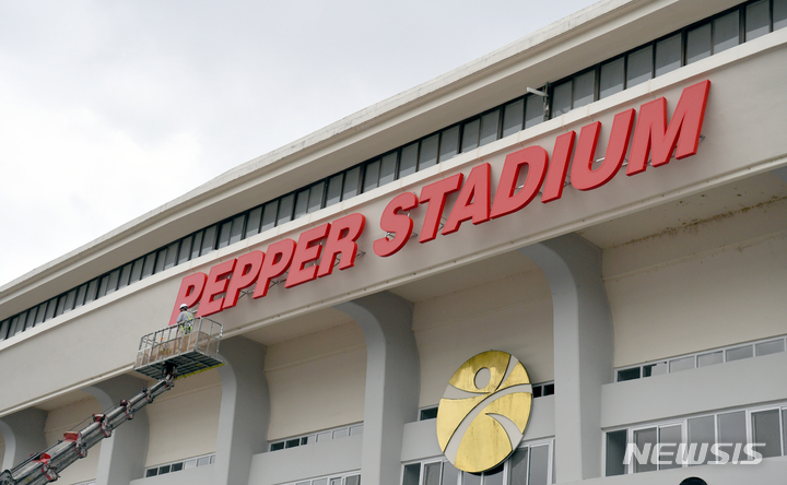 [광주=뉴시스] 류형근 기자 = 여자프로배구 7번째 구단인 '광주 AI페퍼스' 창단식이 이틀 앞으로 다가온 28일 오후 광주 서구 염주동 염주종합체육관 홈경기장 외부에 '페퍼 스타디움(PEPPER STADIUM)' 경기장 명칭이 설치되고 있다. 2021.09.28. hgryu77@newsis.com |