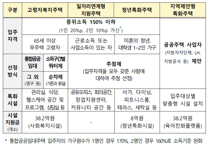 지역제안형 특화주택은 지방정부 등 사업시행자가 출산, 귀농·귀촌 장려 등 지역수요에 맞춰 입주자격, 선정방법, 거주기간 등을 맞춤형으로 설정할 수 있다. 고령자 복지주택은 65세 이상 무주택 고령자에게 미닫이 욕실문, 안전손잡이 등 편의시설이 적용된 주택을 사회복지시설과 함께 제공하는 유형이다. 청년특화주택은 도심 내 역세권 등 우수 입지에 청년 선호 평형과 빌트인 가구 등을 반영해 결혼하지 않은 청년과 대학생을 대상으로 공급하며, 일자리 연계형 지원주택은 중소기업 근로자, 창업가, 산업단지 근로자 등을 대상으로 제공한다.