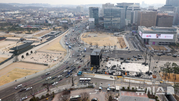 [서울=뉴시스] 김선웅 기자 = 22일 서울 종로구 광화문광장에서 전날 열린 방탄소년단의 'BTS 컴백 라이브 : 아리랑' 공연 무대 철거작업이 진행되고 있다. 2026.03.22. mangusta@newsis.com |