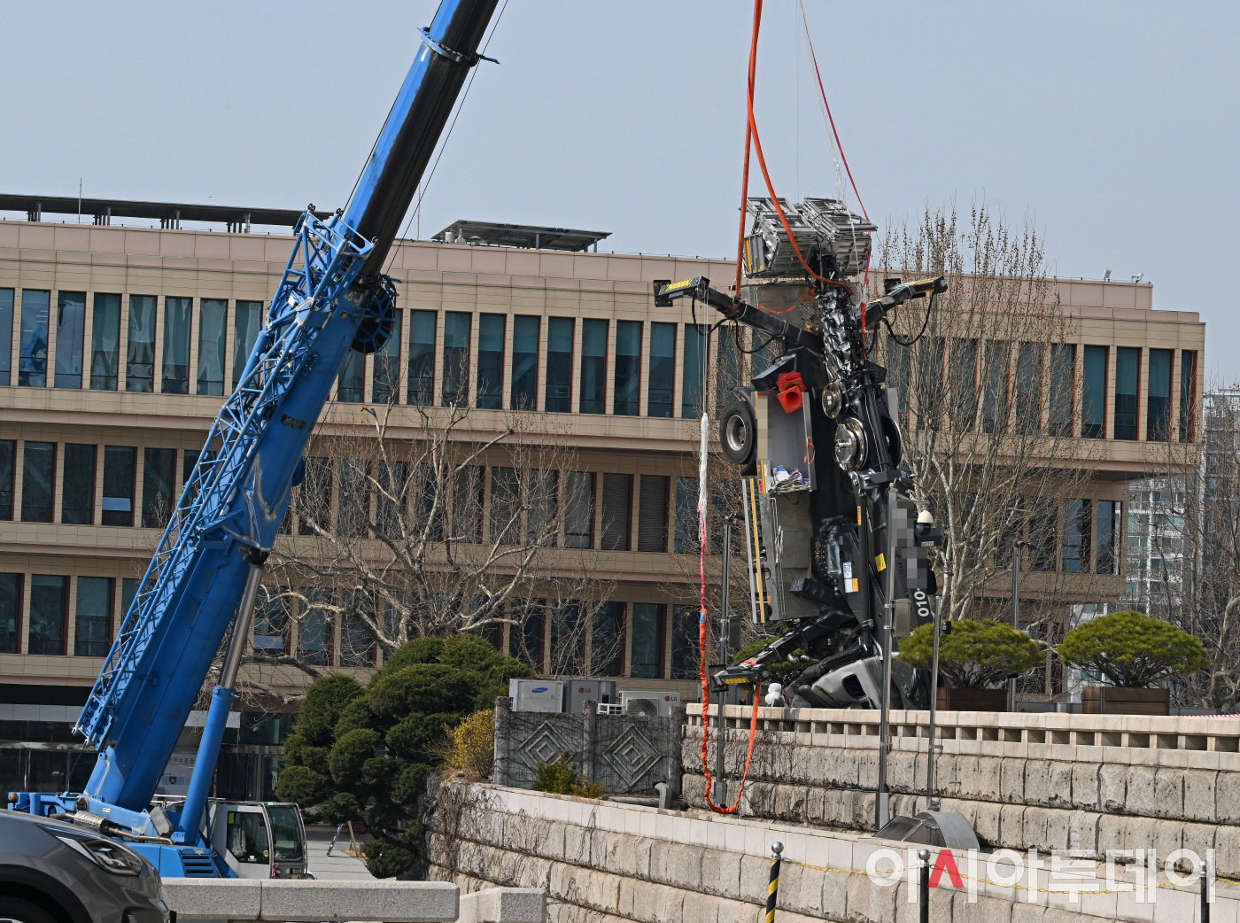 아시아투데이 송의주 기자 = 22일 국회 본관 옆에서 건설 기중기에 매달린 사다리차가 바닥으로 추락해 파손되 있다.