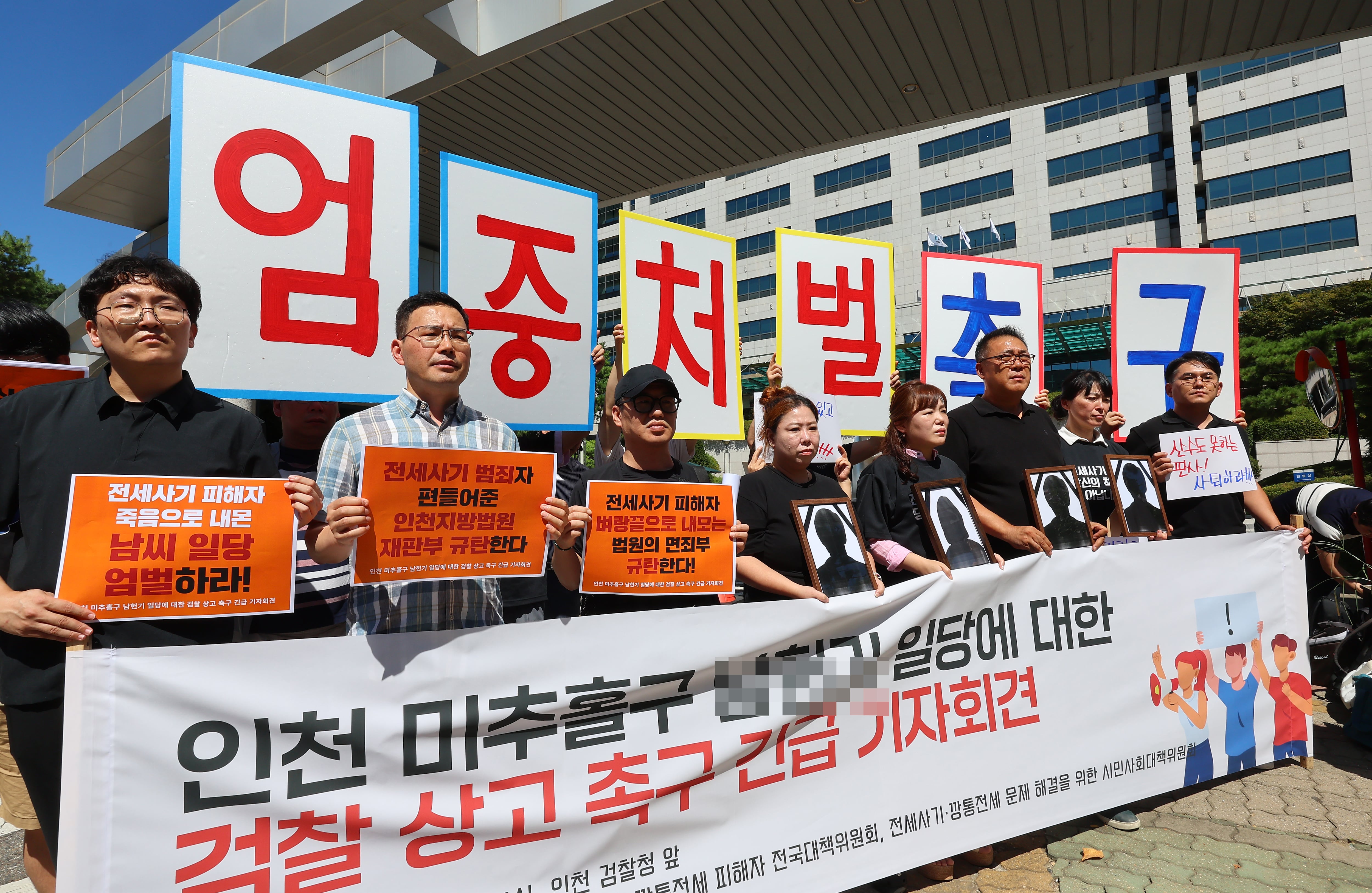 2024년 8월 29일 인천 미추홀구 인천지방검찰청 앞에서 미추홀구 전세사기 피해대책위가 긴급 기자회견 열고 전세사기범에 대해 징역 7년으로 감형한 2심 선고 대한 검찰의 상고를 촉구하고 있다. /연합뉴스 |