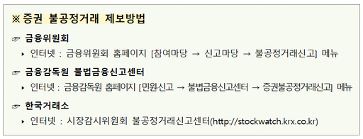금융당국은 오는 23일부터 '불공정거래 집중제보기간'을 운영한다. 금융당국은 접수된 제보 내용에 혐의가 발견되는 경우 즉시 조사에 착수하며, 불공정행위를 신고하고 혐의 입증에 도움이 되는 자료를 제공한 신고자에게는 '부당이득+몰수금 30%'에 해당하는 포상급도 지급한다.
