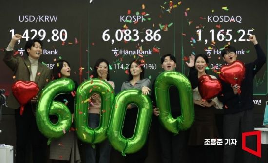 코스피가 사상 처음으로 6000선을 돌파하며 장을 마감한 25일 서울 중구 하나은행 본점 딜링룸에서 직원들이 축하 세레머니를 하고 있다. 이날 코스피 지수는 전장 대비 114.22포인트(1.91%) 오른 6083.86으로 장을 마쳤다. 2026.2.25 조용준 기자 |