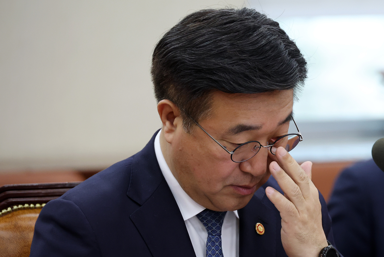 윤호중 행정안전부 장관이 지난 18일 국회에서 열린 행정안전위원회 전체회의에서 안경을 고쳐쓰고 있다. [연합] |