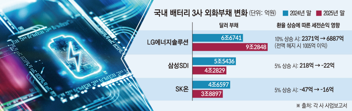 삼성SDI와 SK온은 외화부채 자체를 줄이며 환율 리스크를 관리하고 있다. 삼성SDI의 달러 부채는 2024년 5조5436억원에서 지난해 4조2829억원으로 SK온은 같은 기간 4조6597억원에서 3조8897억원으로 각각 감소했다. 설비투자 축소 기조가 외화부채 감소로 이어진 영향으로 분석된다.