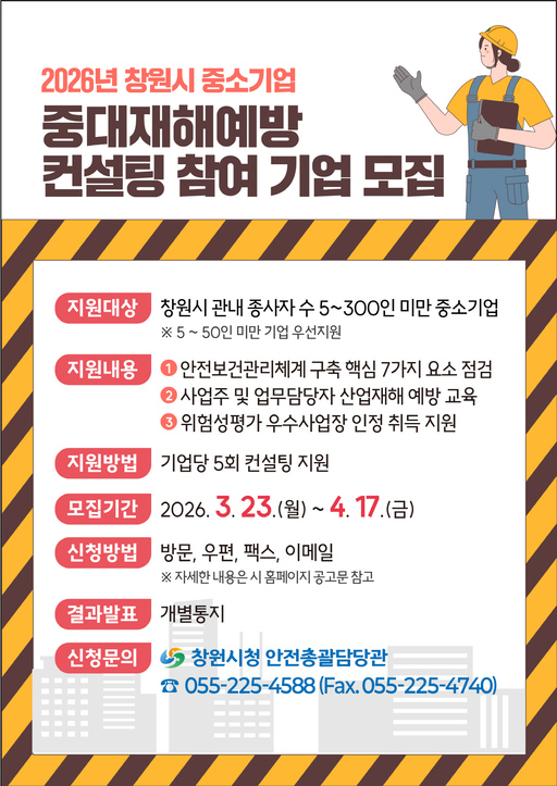 신청 기간은 3월 23일부터 4월 17일까지로, 창원시청 홈페이지 공고문의 신청서를 작성해 방문 또는 이메일로 접수하면 된다. 컨설팅은 고용노동부 인증 안전관리 전문 기관이 기업을 직접 방문해 산업재해 예방 교육과 안전보건관리체계 구축을 지원하며 최종적으로 위험성 평가 우수 사업장 인정 취득을 목표로 한다.