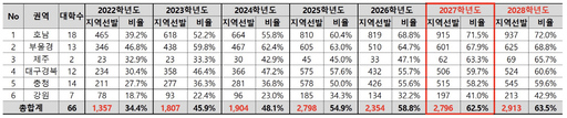 비율 변화도 뚜렷하다. 지방권 의치한약 전체 선발 인원 가운데 지역학생 선발 비율은 2022학년도 34.4%에서 △2023학년도 45.9% △2024학년도 48.1% △2025학년도 54.9% △2026학년도 58.8% △2027학년도 62.5%까지 높아질 것으로 보인다. 2028학년도에는 63.5%까지 확대될 전망이다. 지방권 의치한약 선발 구조가 사실상 지역학생 중심으로 바뀌고 있다는 의미다.