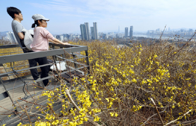 [이데일리 방인권 기자] 완연한 봄날씨를 보인 22일 서울 성동구 응봉산에 개나리가 피어 있다.