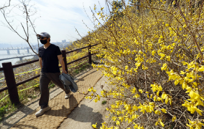 [이데일리 방인권 기자] 완연한 봄날씨를 보인 22일 서울 성동구 응봉산에 개나리가 피어 있다.