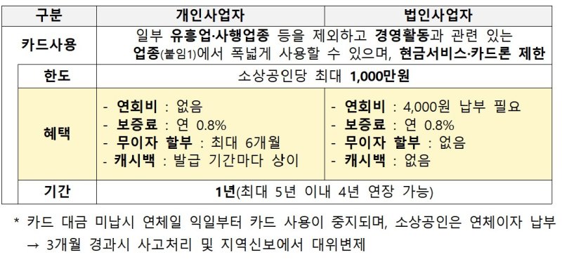 신용 점수 요건은 기존 나이스(NICE) 신용평점 595~879점에서 595~964점으로 확대됐다. 업력 기준은 1년 이상에서 6개월 이상으로 낮췄다. 경기신용보증재단의 '힘내GO 카드', 부산신용보증재단의 '3무 희망잇기 신용카드'처럼 지역신보의 유사 보증상품을 이미 이용한 소상공인도 한도 제한 없이 최대 1000만원을 모두 지원받을 수 있다.